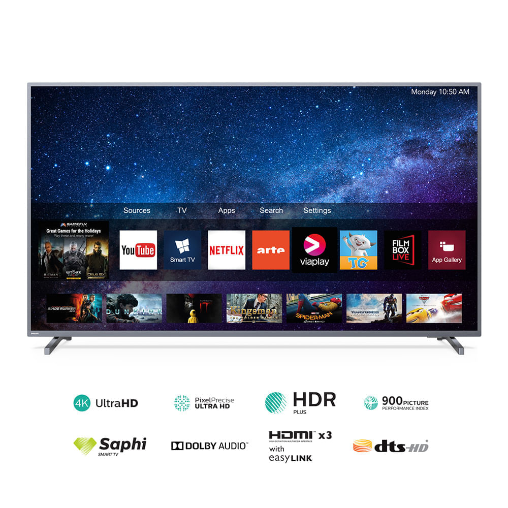 Pixel Precise Ultra HD garantiza que todo tenga un aspecto natural y nítido mientras SAPHI brinda un acceso instantáneo a tu contenido favorito. Smart TV LED 4K UHD. La función Ambilight ayuda a crear ambiente para la reproducción de películas música o juegos.